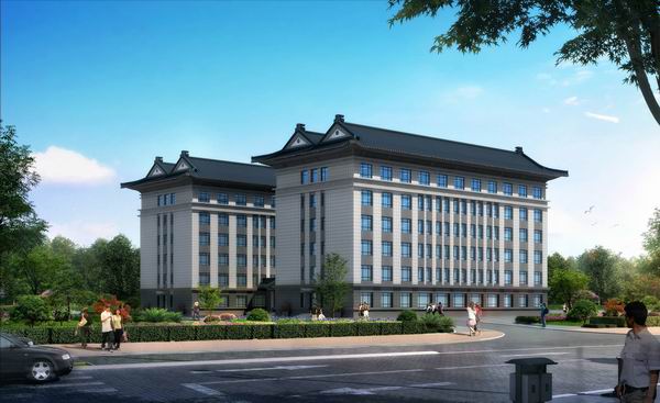 基于党校作为党的执政思想与能力培训基地的性质,我们赋予建筑以庄重的气质,力求在建筑形象中传承中国共产党与时俱进的时代精神。在正德楼—教学办公综合楼前设置中正、对称的礼仪广场,广场宽约65M。校区中教学办公楼为21层,以突出主体形象,裙房均为1-3-5层,学员食堂建筑以2层为主,学员宿舍建筑为5-6层。建筑屋顶以重檐坡屋顶为主,体现中国传统文化的特征。墙面为鲁灰、芝麻白的石材效果,造型端庄、厚重,蕴含了坚毅、稳重、大气磅礴的气质。多层建筑屋檐出挑深远,横向伸展,结合地形高低错落,与周围环境巧妙结合,与园林庭院融为一体。